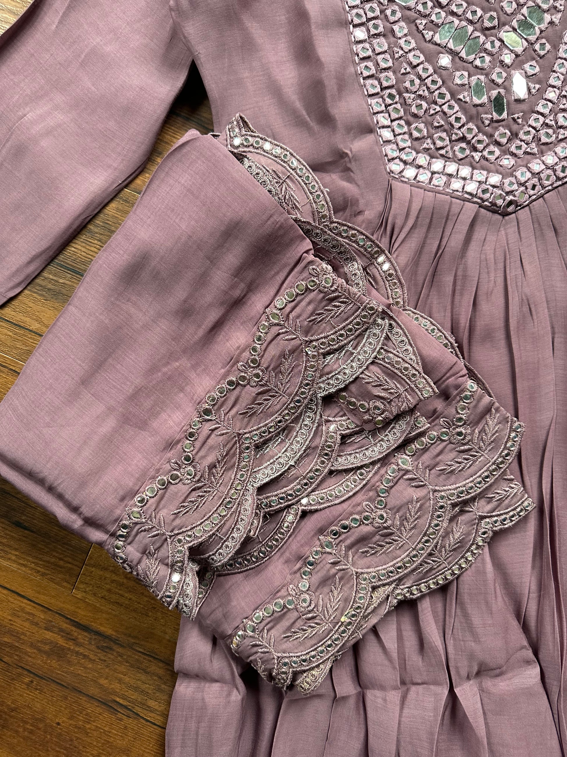 Paired with matching straight-fit pants, the set ensures comfort and effortless coordination. The ensemble is completed with a matching mauve dupatta, adorned with elegant embroidered borders that add a luxurious finishing touch.