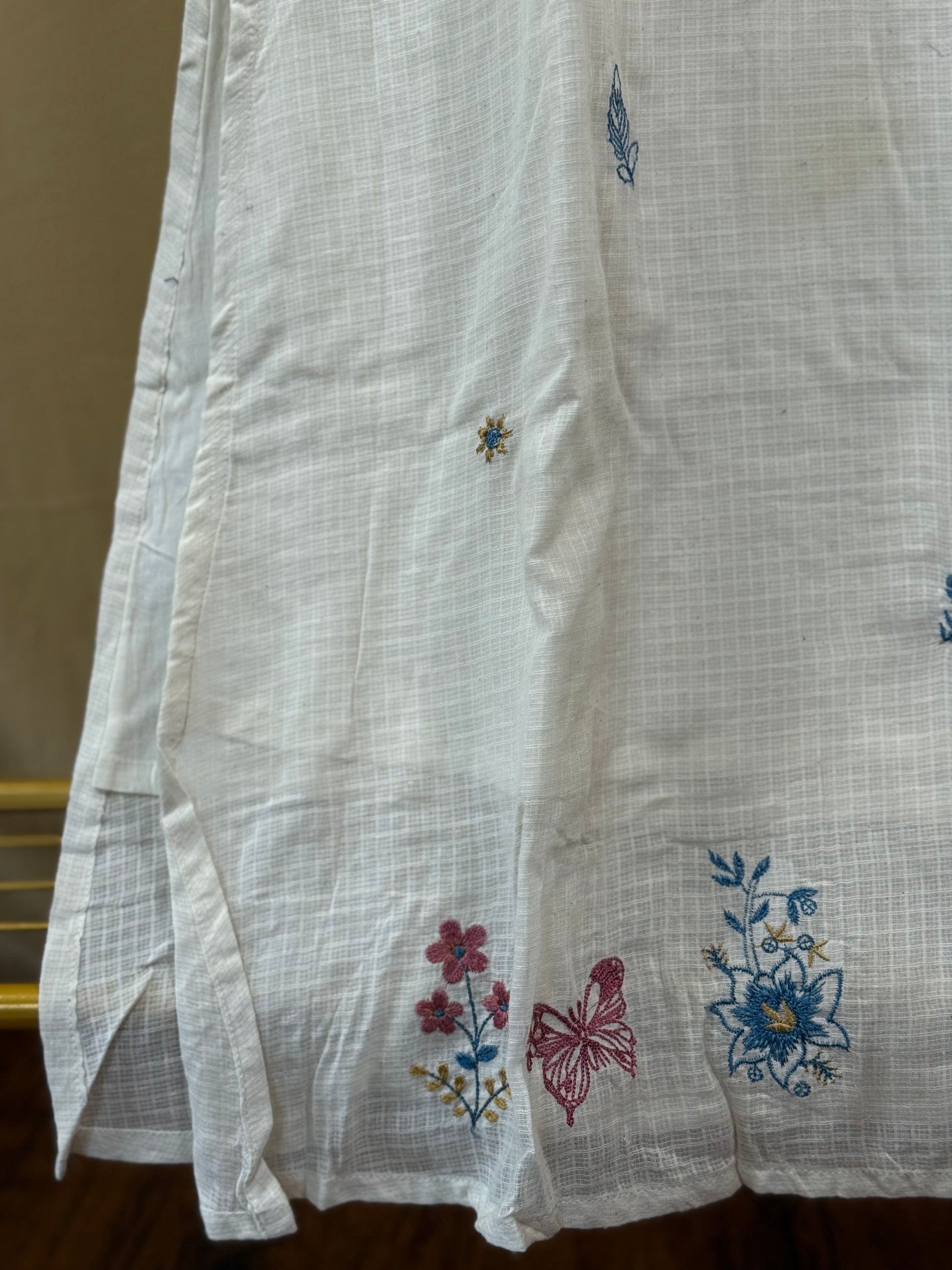 The kurta is beautifully adorned with delicate multicolour floral embroidery scattered across the body, with enhanced detailing along the yoke, neckline, sleeves, and hemline. The round neckline is accentuated with a buttoned placket, adding a classic touch to the contemporary design. The three-quarter sleeves are finished with embroidered borders, elevating the overall look with refined craftsmanship.