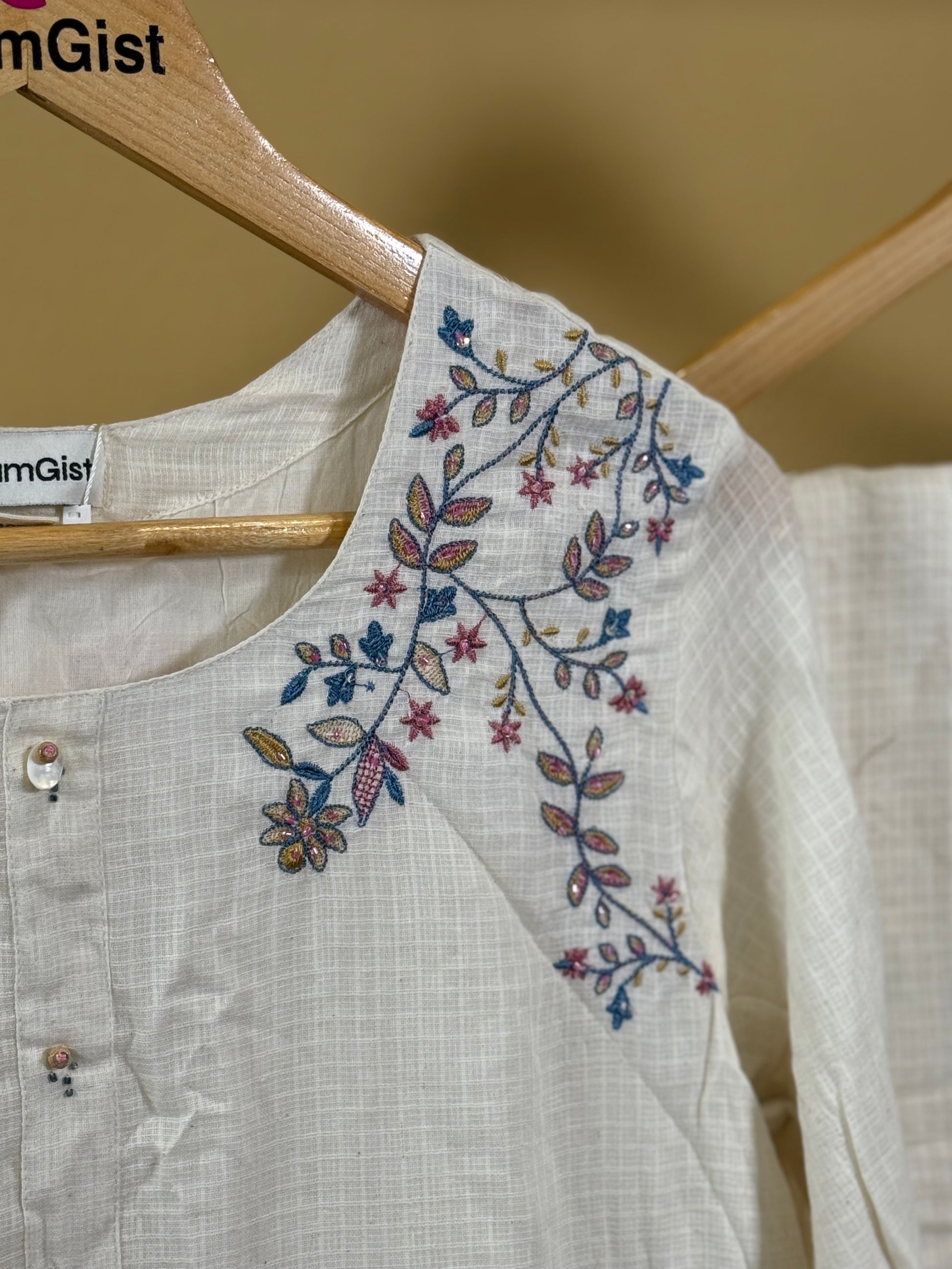 This graceful ivory kurta set is a celebration of subtle florals and timeless elegance. Crafted in a soft, textured dori fabric, the kurta features a straight silhouette that offers both comfort and a flattering fall, perfect for everyday elegance and festive daytime wear.